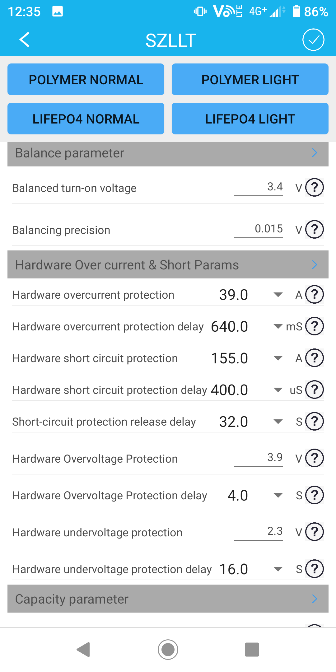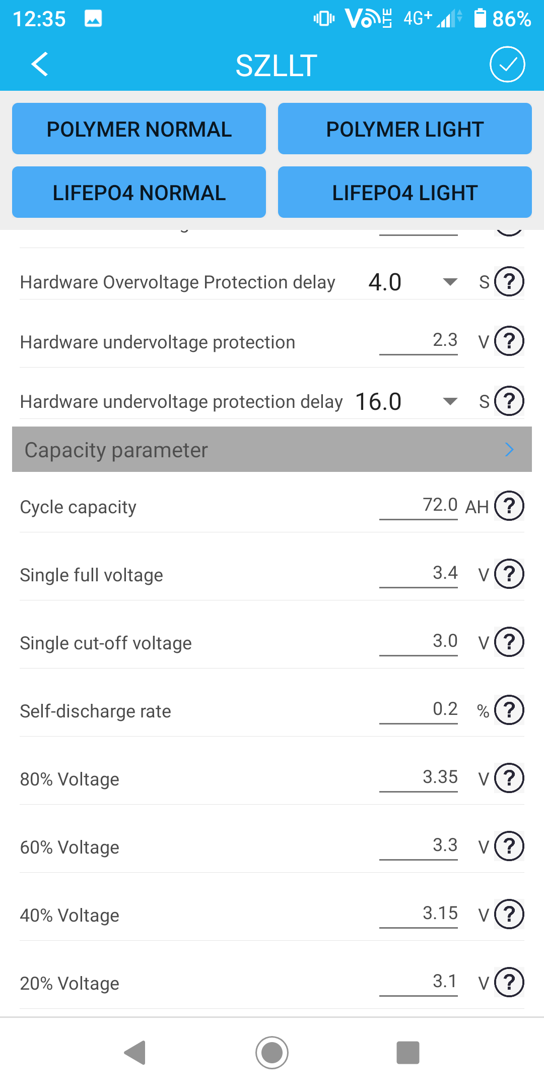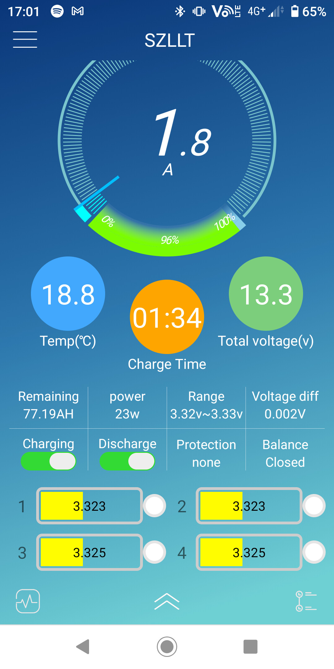 Habt ihr eigentlich alles das Balancing auf always on? D.h , dass es auch balancen tut, wenn nicht geladen wird. Würde ich unbedingt machen. Die Schwelle würde ich auf um die 3.4V setzen.