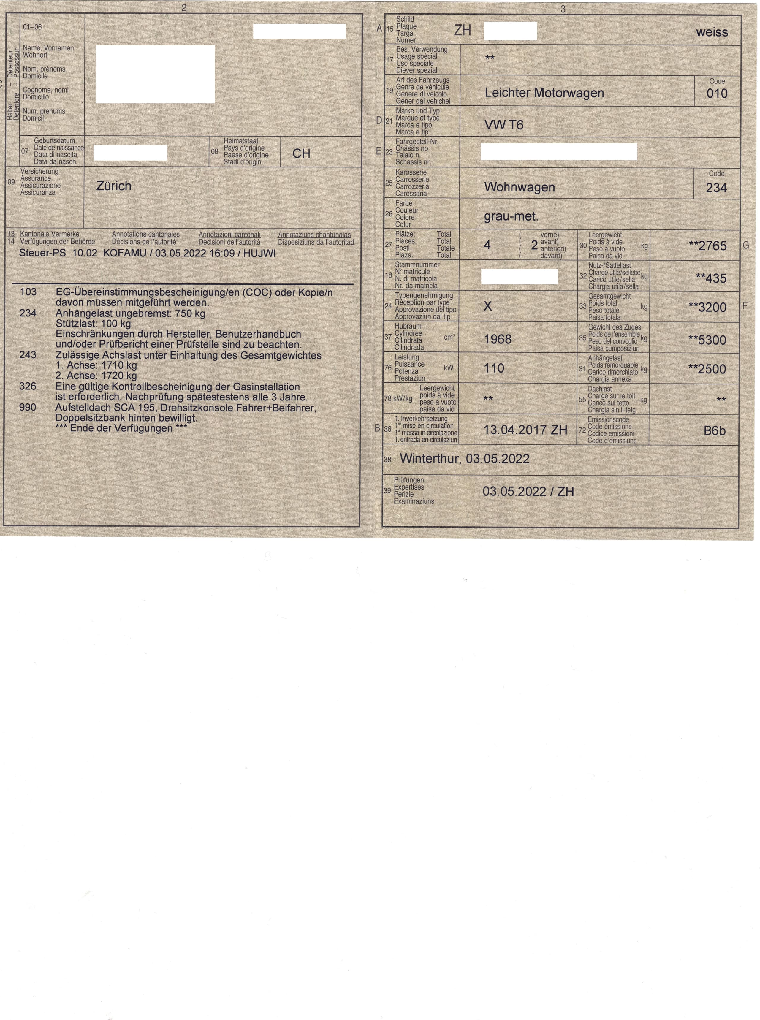 Zulässiges Gesamtgewicht 3200kg mit 17’’ Stahlrädern