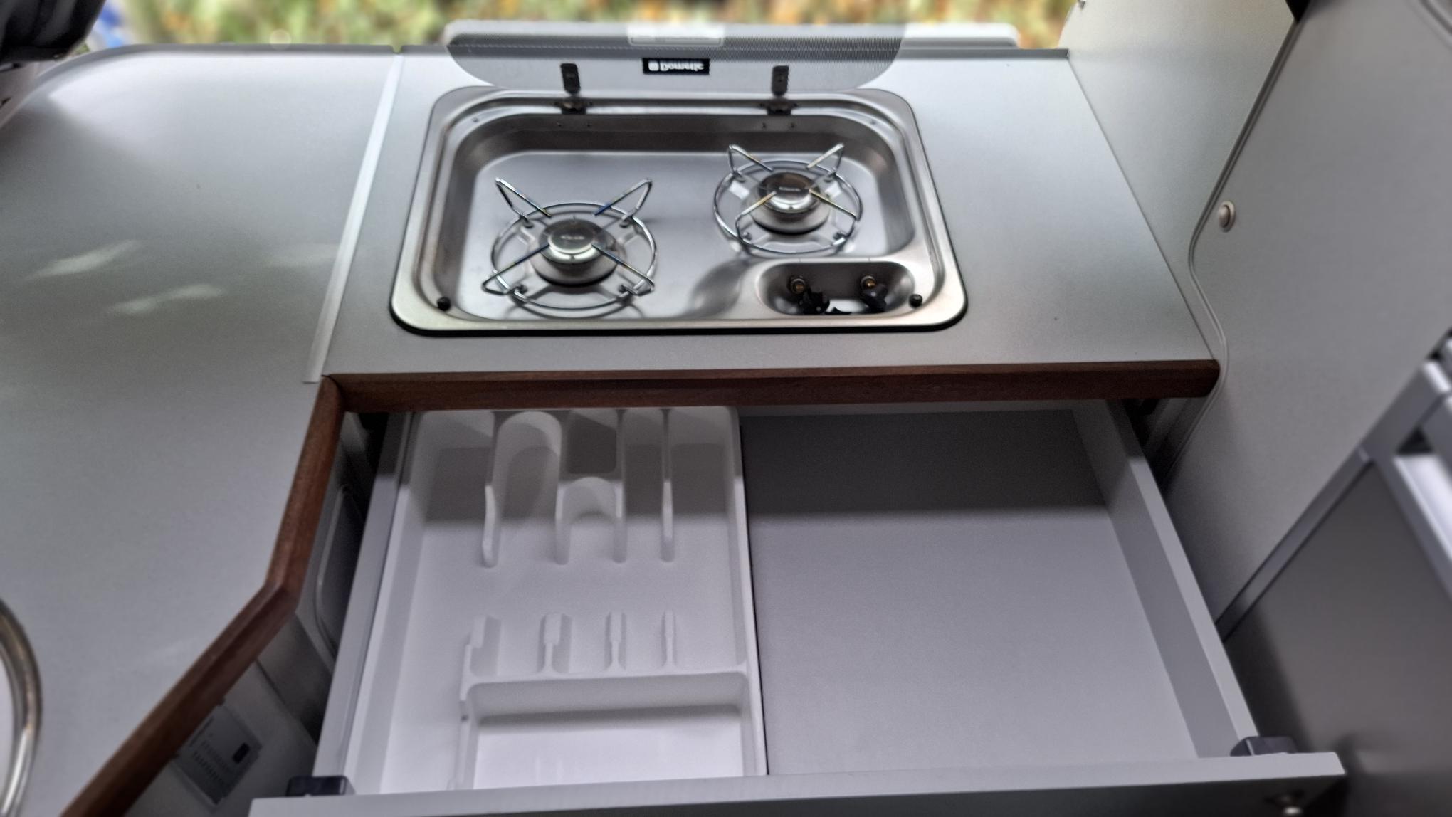 Heckküche mit 2 Flammen Gaskocher
