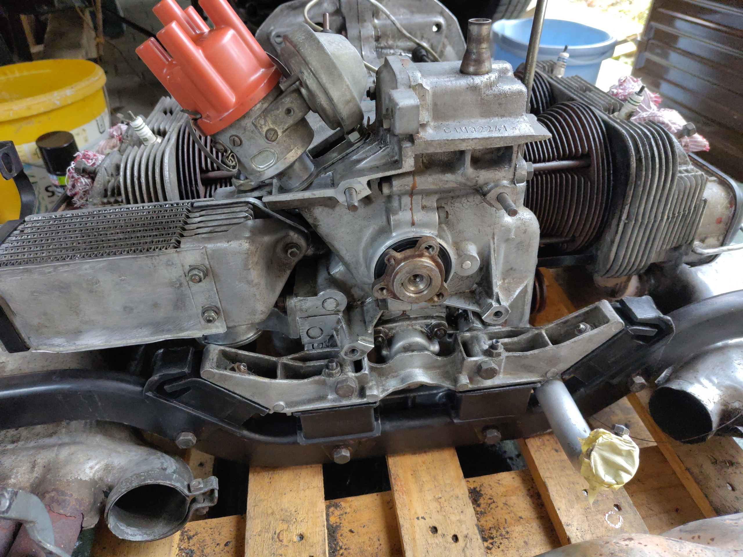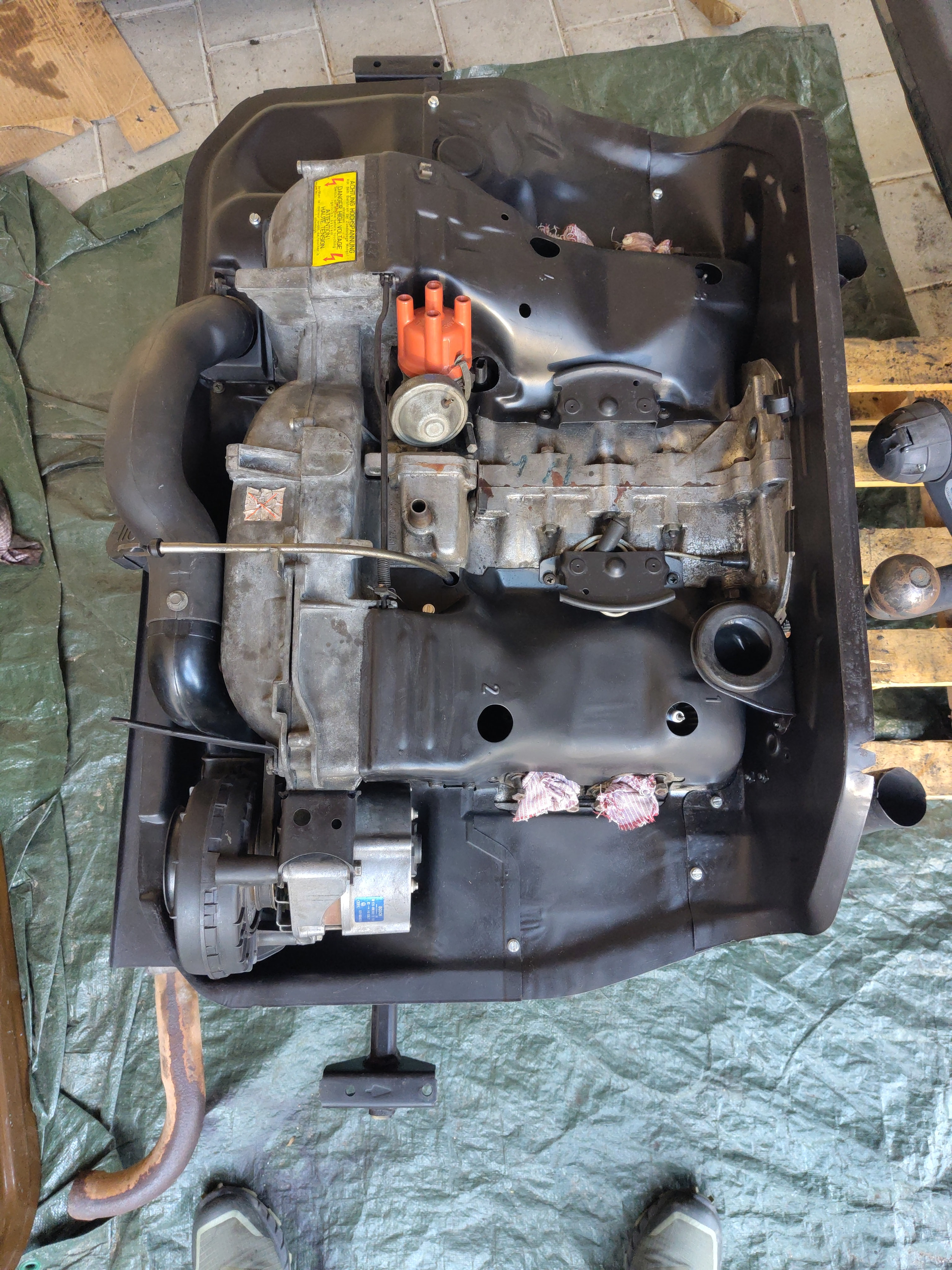 Folglich habe ich im Carport vor dem Haus den Motor ausgebaut. (Hier muss ich vielleicht dazu sagen, dass ich in einem früheren Leben Automechaniker gelernt habe :-)) Beim Zerlegen habe ich vorzu alles mit dem Handy abfotografiert. Um den Motor mit einem Palettrolli unter dem Bus hervor zu ziehen, musste ich den Bus noch etwas anheben. Das Getriebe blieb an den Antriebswellen unter dem Bus.