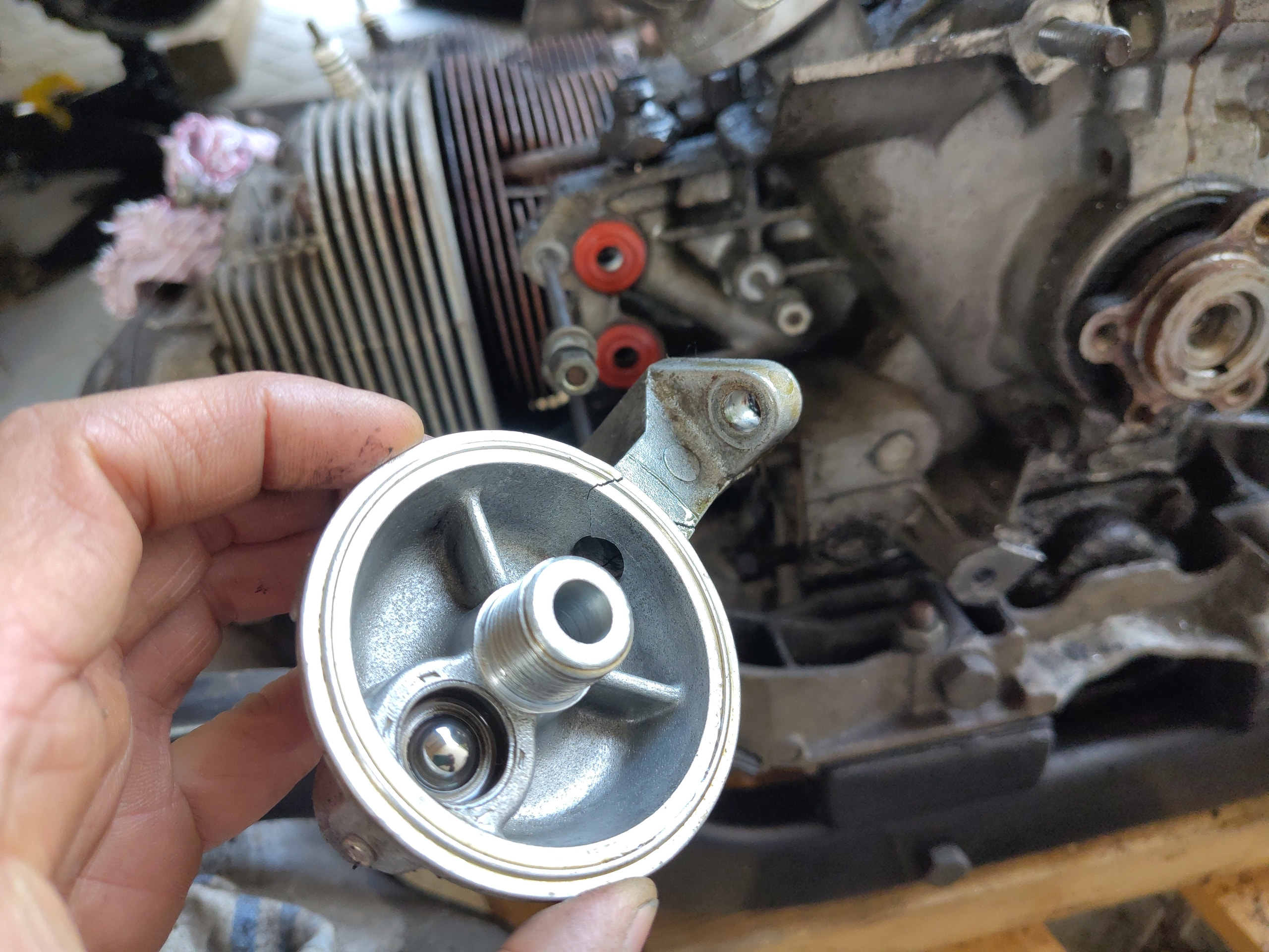 Das gebrochene Teil war im Internet unschwer zu besorgen (hier mit dem Sandwich-Adapter für den Kühler fotografiert):