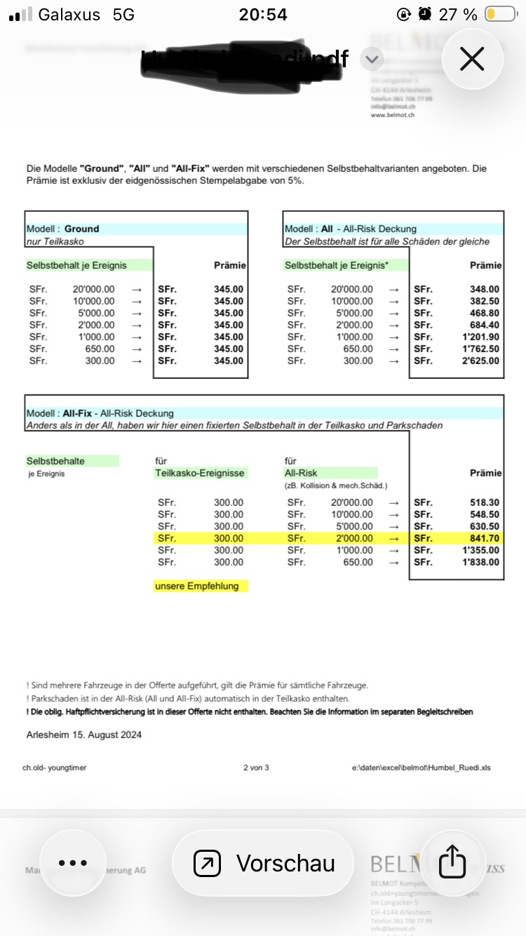 wichtig bei Versicherungen - schaut euch die Konditionen und Selbstbehalte an. In diesem Fall ist der Selbstbehalt beim Teilkaskoschaden (zB Steinschlag in der Windschutzscheibe) bei CHF 300.- üblich sind da oftmals CHF 0 und der Sebsbehalt in der All Risk (Kasko) liegt bei CHF 2‘000.- Standard sind oft CHF 1‘000.- . Je nach finanzieller Lage sind höhere Selbstbehalte durchaus sinnvoll & tragbar. Und die Haftpflicht käme hier auch joch dazu.