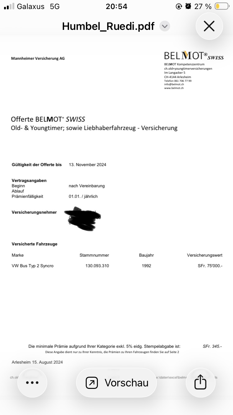 Ich bin seit Jahrzehnten bei der Vaudoise. Habe dort 2 Auto’s, 1 T3, 3 Motorräder und 2 Kleinmotorräder versichert. 1PW und der T3 laufen auf Wechselnummer. T3 ist Vollkasko versichert ebenso der dazugehörende PW. T3 ist auf 35’000 CHF versichert. Dafür zahle ich 1000.- im Jahr. Muss aber erwähnen, dass ich sehr gute Spezialkonditionen bei denen geniesse, wegen der langen Zugehörigkeit.