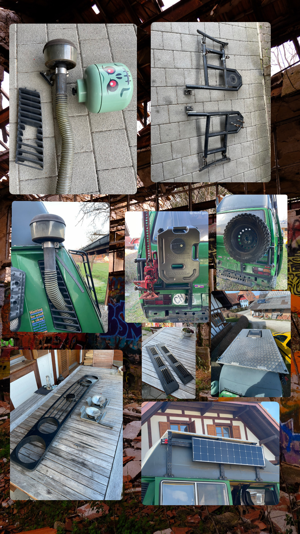 Hallo Zusammen bin Bastian und neu hier im Forum. Baue meinen Bus auf Original zurück und Biete hier diverse Offroad Anbauteile für einen VW T3 an. Reserveradhalterung selbst geschweisst kein china bau, begehbaren Dachträger für einen Westfalia mit hochdach (hatt eine fest verbaute Hängematten halterung) , Zyklonfilter (Schnorchel mit gitter ausgeschnitten für Diesel motoren) originaler Südafafrikagrill (müsste neu lackiert werden) mit neuen Scheinwerfern… Sorry fürs Bild darf nur ein Foto hochladen da ich neu hier bin.