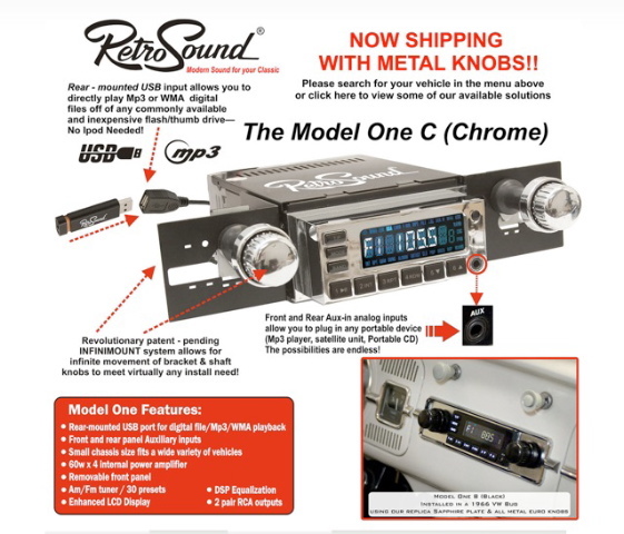 Verkaufe einen Retro-Radio für VW-Bus - Typ: RetroSound Model One mit Chrom-Frontplatte und VW 1958-67 Set inkl. Chrom-Drehknöpfe. Sieht aus wie ein altes Autoradio, spielt jedoch FM, MP3 (auf USB-Stick bis 999 Stücke oder bis 8 GB), steuert zusätzl. CD-Wechsler, 4 mal 60 Watt oder 4x RCA Preamp-Output.
