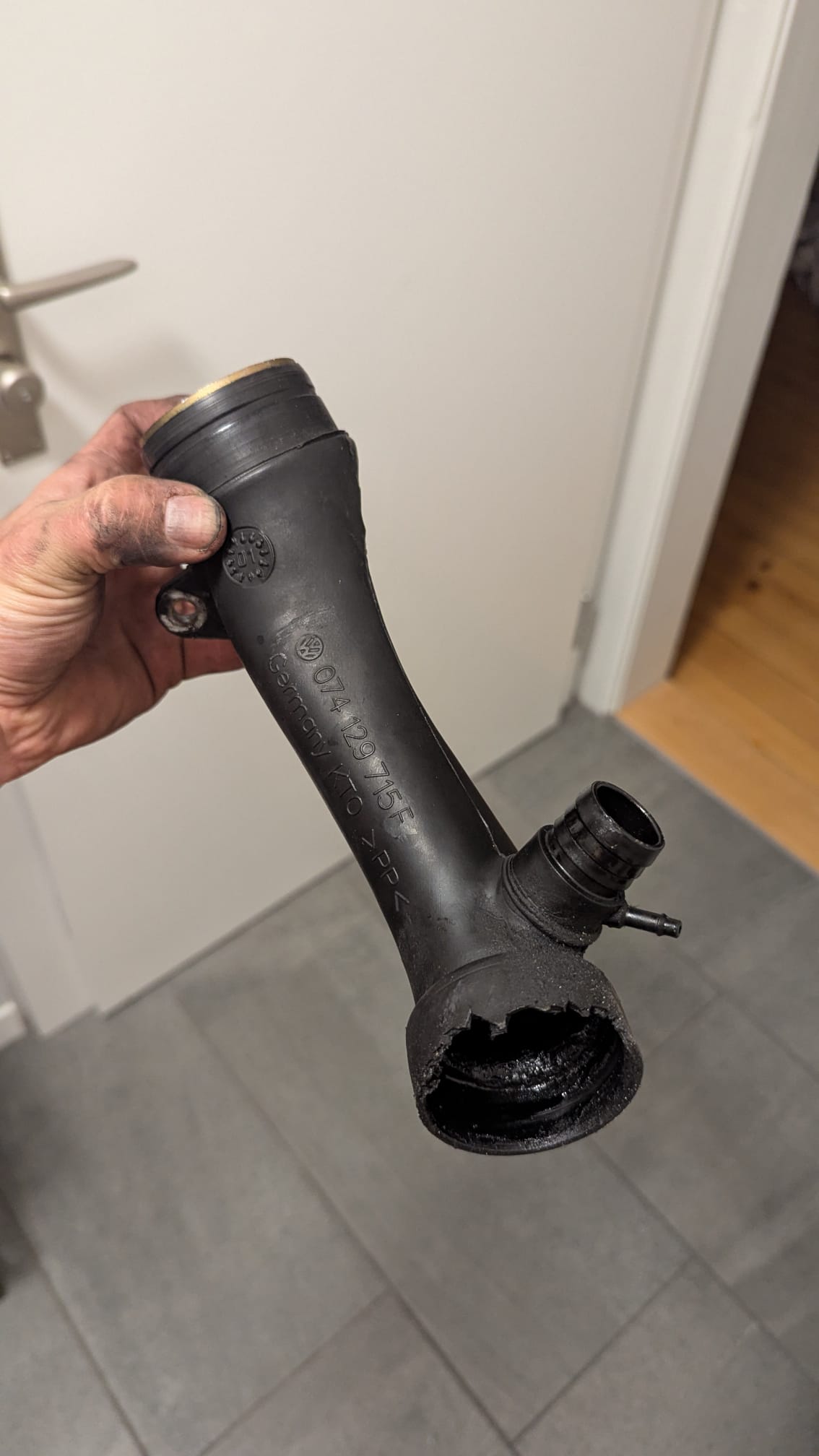 Ich habe das Ansaugrohr zum Turbolader abmontiert. Er ist am ende zum Turbolader sehr spröde und abgebröckelt. Das gute Stück kann man nicht mehr bestellen und ich finde es nicht einmal mehr bei einem Autoverwerter in der Region. Ein “Busslikenner” sagte mir.. uuh das könnte schwierig werden. Im Netz finde ich gebrauchte in Deutschland. Sehen aber zum Teil auch schon sehr genutzt aus und kosten viel Geld.