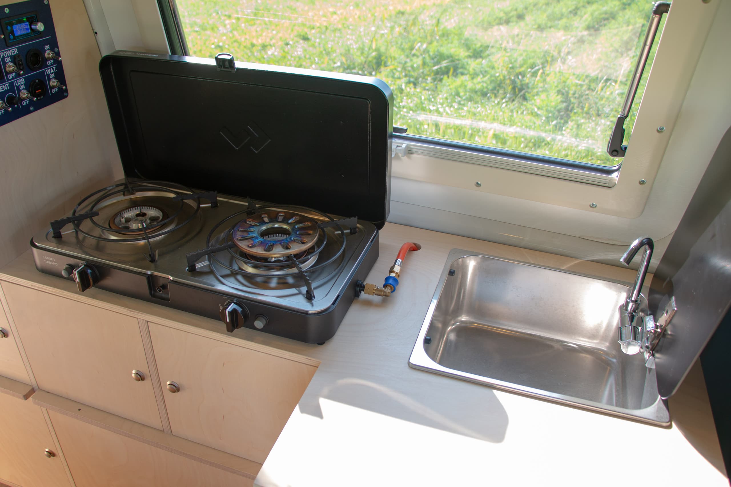 Gekocht wird auf einem Cadac Gaskocher, versorgt durch 500g Kartuschen. Der Kocher ist für Innenräume zugelassen und wurde vom Aargauer Strassenverkehrsamt abgenommen. Hierfür muss er aber fest montiert werden.