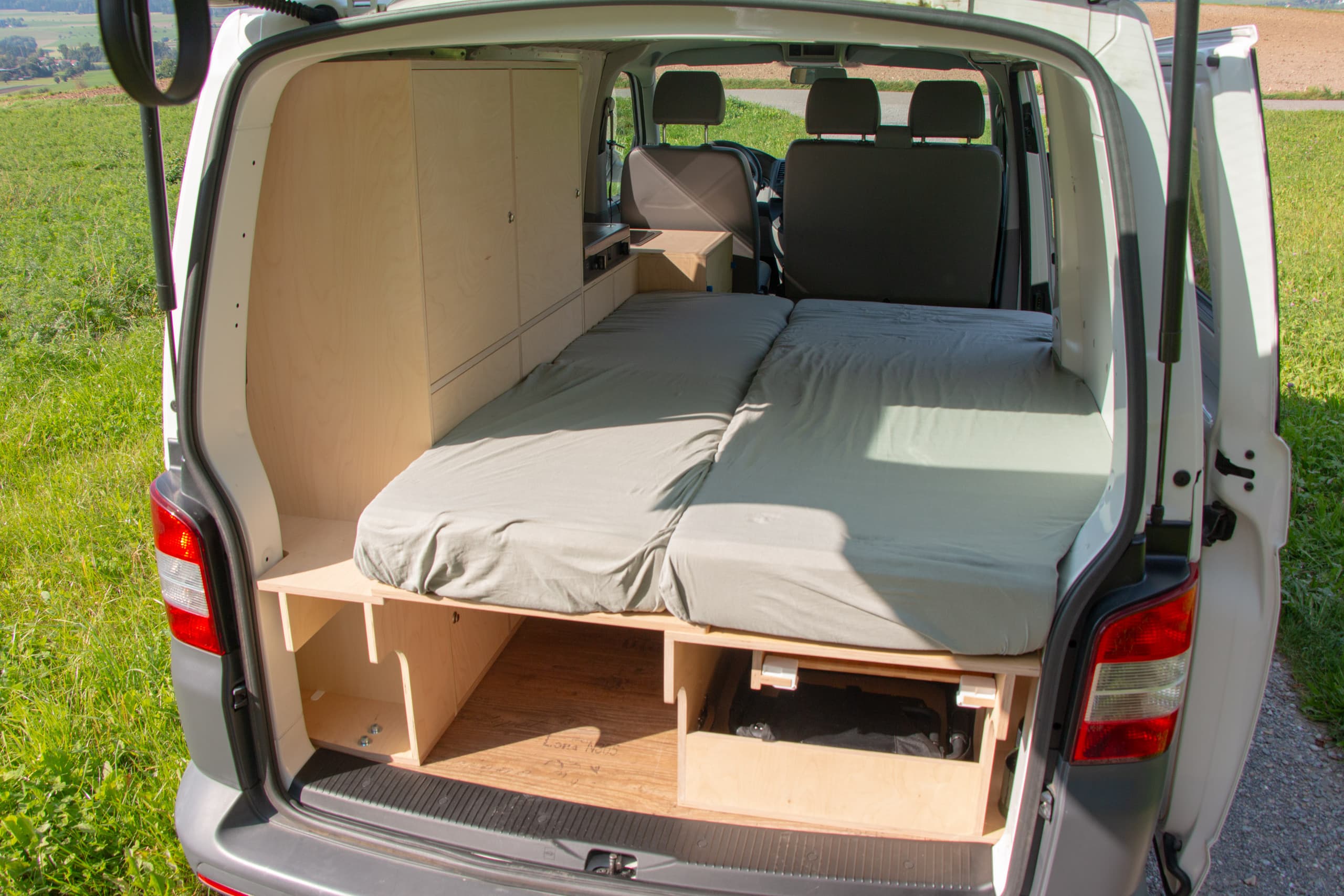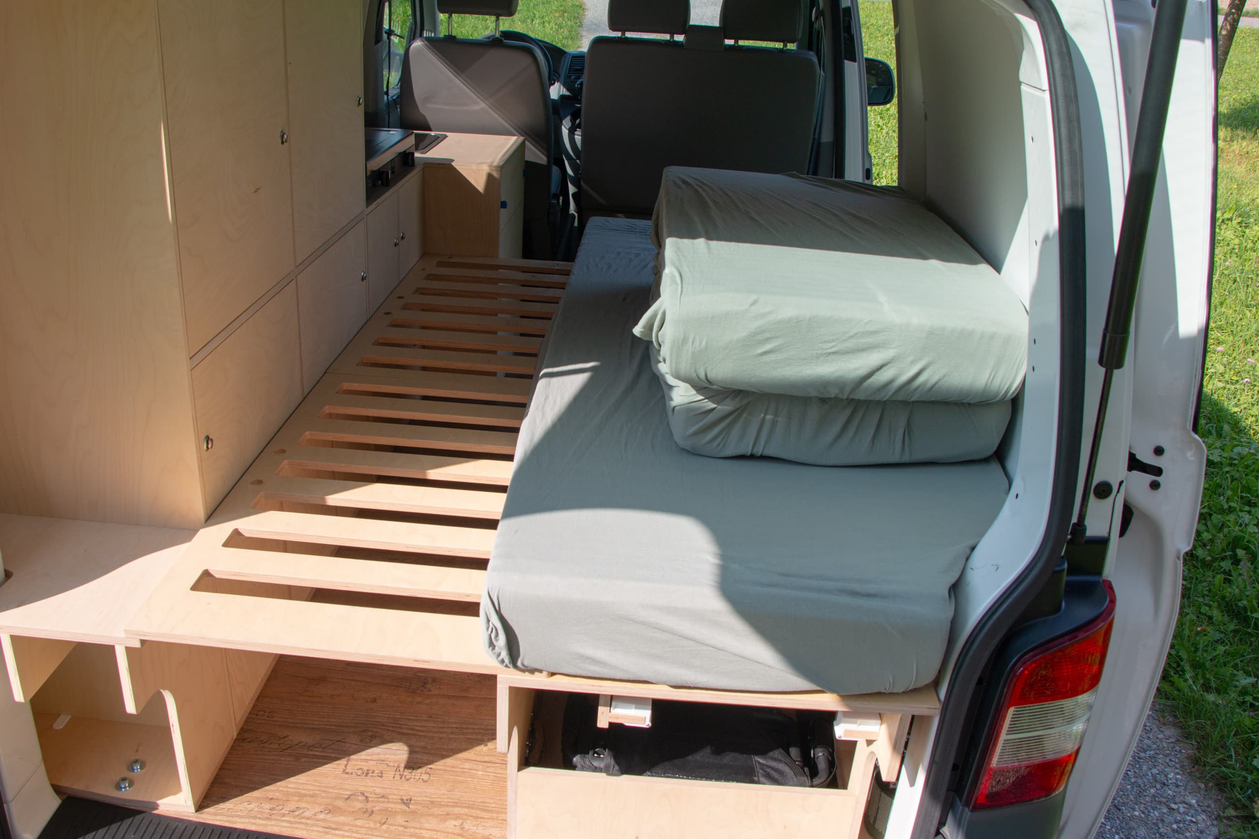 Die Schrankfächer sind im Innern noch zusätzlich unterteilt. Im hinteren Bereich der längs verbauten Bank lassen sich ein faltbarer Tisch und zwei Klappstühle gut verstauen. Ersterer wird auf zwei Führungen aus Holz getragen und von den zwei weissen Haltern am Verrutschen gehindert. Auf den Fotos nicht zu sehen: die Bank hat zur Mitte hin noch Türen, damit man auch von dort gut ans verstaute Material kommt.
