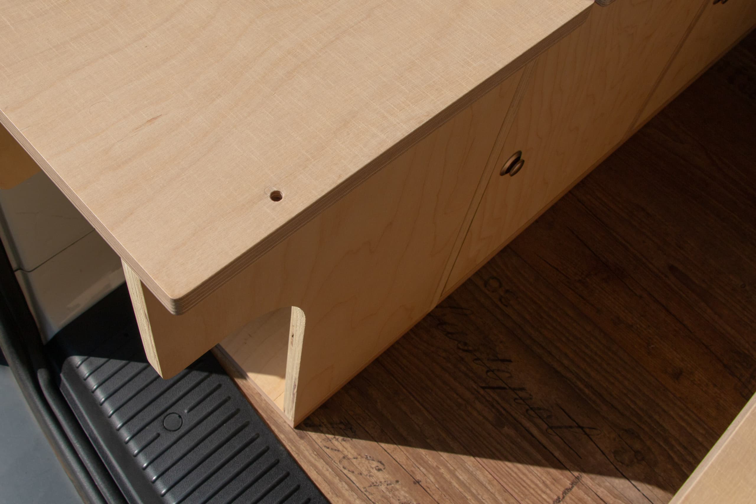 Alle Möbel sind CNC gefräst und mehrheitlich aus 15mm Birken-Multiplex gefertigt. Die Bohrungen für Möbelverbinder, Pushlock-Verschlüsse und Scharniere habe ich gleich mit gefräst. Weil die Möbel beide eine Bodenplatte haben, können sie ausserhalb des Fahrzeugs zusammengebaut und dann einfach hineingehoben werden. Es waren keine Nacharbeiten nötig, nachträglich betrachtet hätte ich meine eingefügten Toleranzabstände an den anliegenden Kanten sogar weglassen können. Da habe ich dem 3D-Scan zu wenig vertraut.
