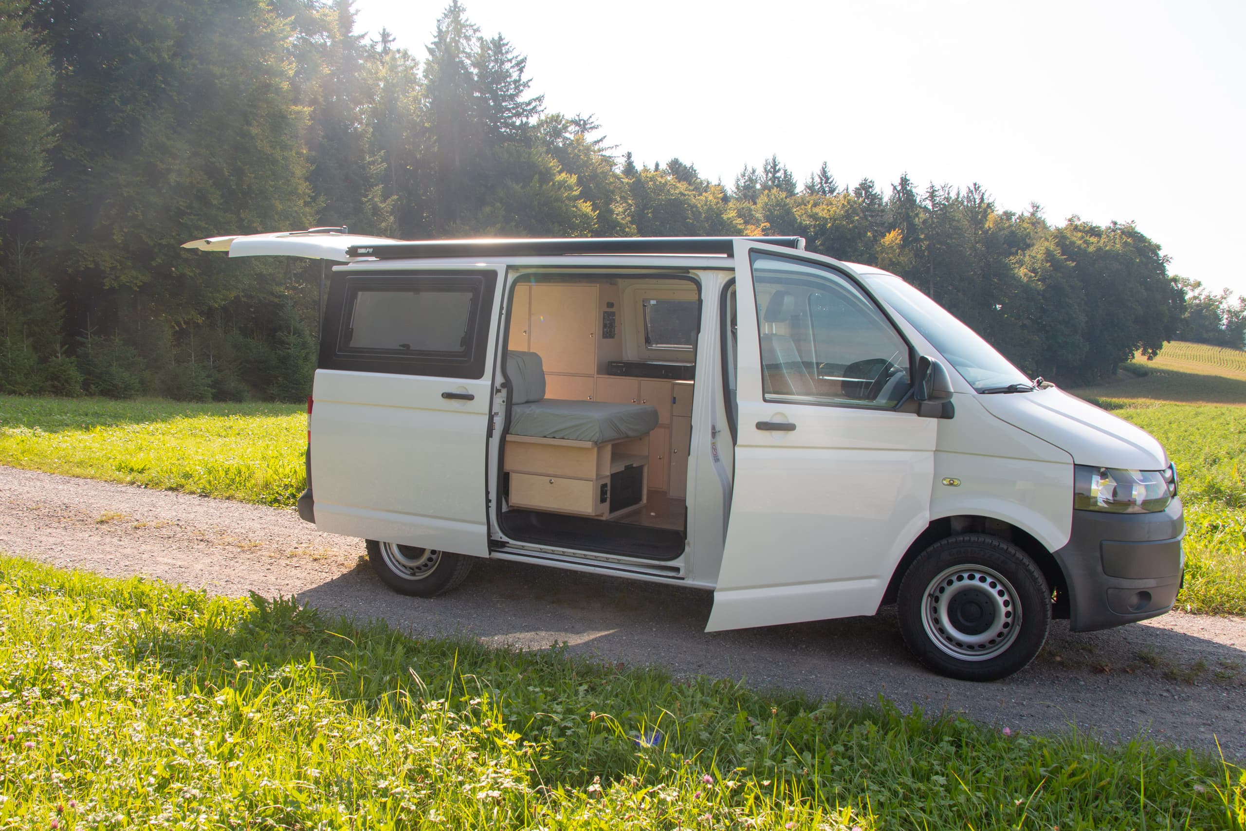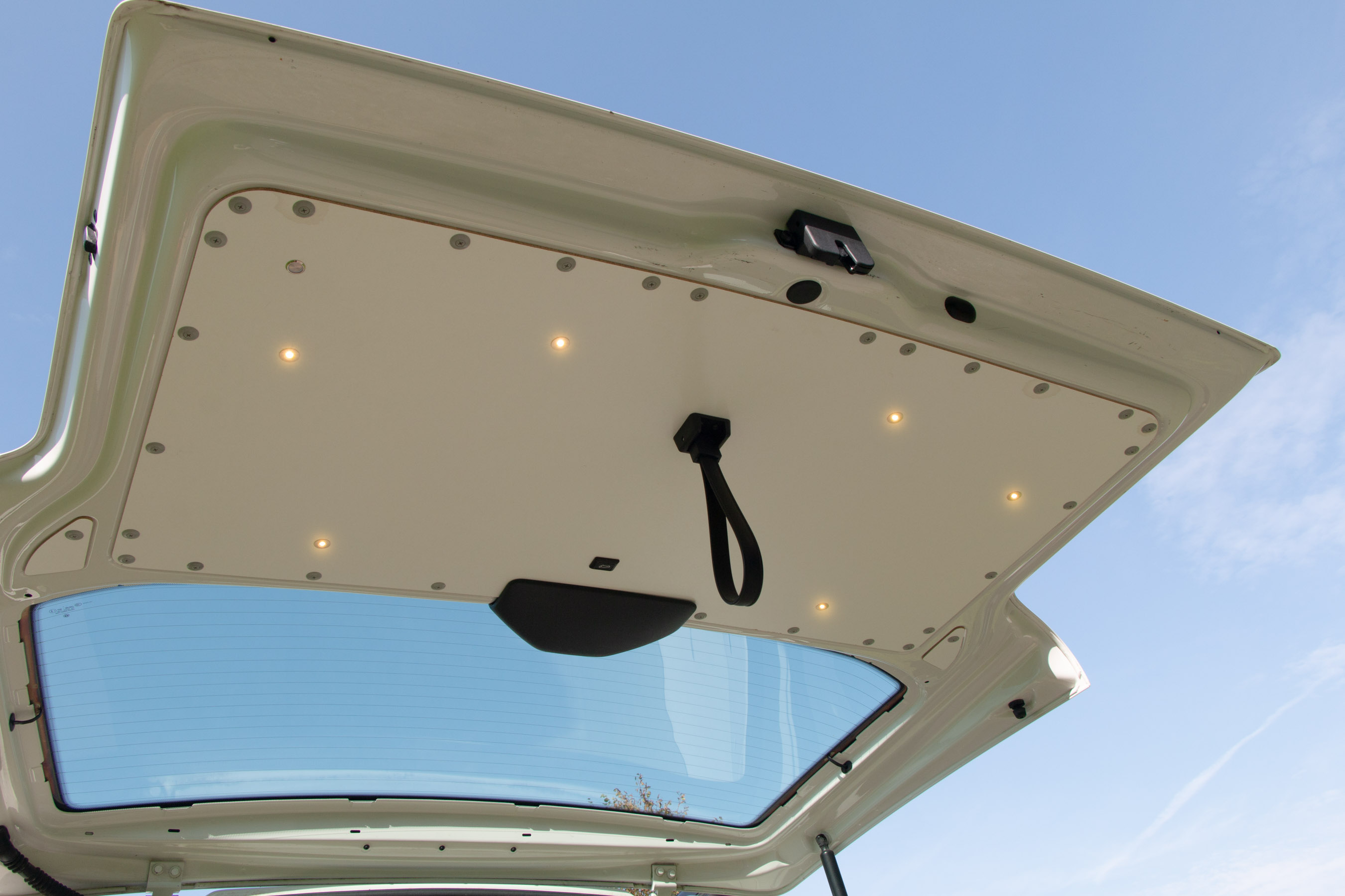 Am grundlegenden Fahrzeug habe ich, abgesehen von kleineren Reparaturen und Servicearbeiten, nicht viel schrauben müssen. Die Wandverkleidungen aus Alu, Holzboden und die Trennwand wurden entfernt und der ganze Innenraum mit einem 3D-Scanner vermessen. Neben der fast schon obligatorischen Autoterm Standheizung mit der von VW vorgesehenen Luftführung in der B-Säule habe ich einen Tempomat nachgerüstet. In der Heckklappe habe ich einen zusätzlichen Taster verbaut, um diese auch von Innen öffnen zu können.