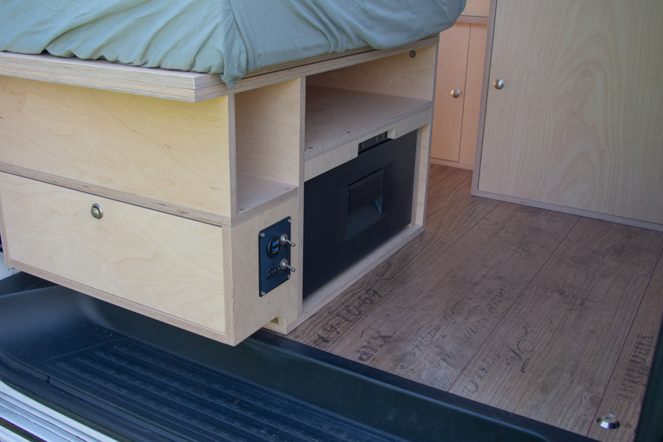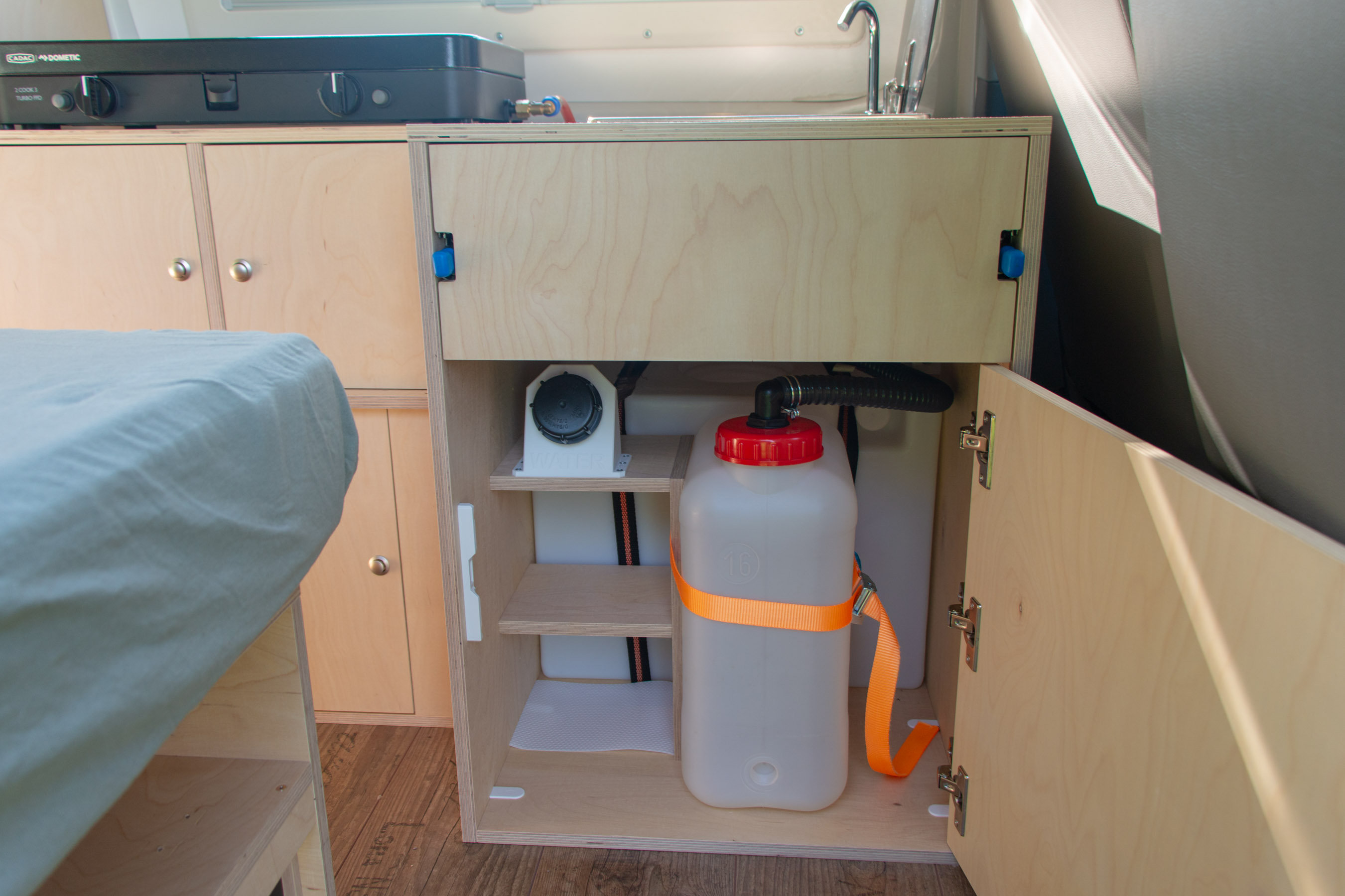 Für Kühlwaren und Getränke ist in der Bank stirnseitig eine Kühlschublade verbaut, welche sich auch von aussen gut erreichen lässt. Der Frischwassertank fasst ca. 60 Liter und wird von innen befüllt, weil ich keinen Wanddurchbruch wollte, welcher die Montage und Demontage des Möbels erschwert. Für das Abwasser wird ein 16l Kanister genutzt. An diesem ist normalerweise ein kapazitiver Füllstandssensor verbaut, der die Pumpe stoppt, sobald der Abwasserkanister voll ist. Das Waschbecken hat eine Glasabdeckung und lässt sich bei Nichtgebrauch schliessen und ebenfalls als Ablagefläche nutzen.