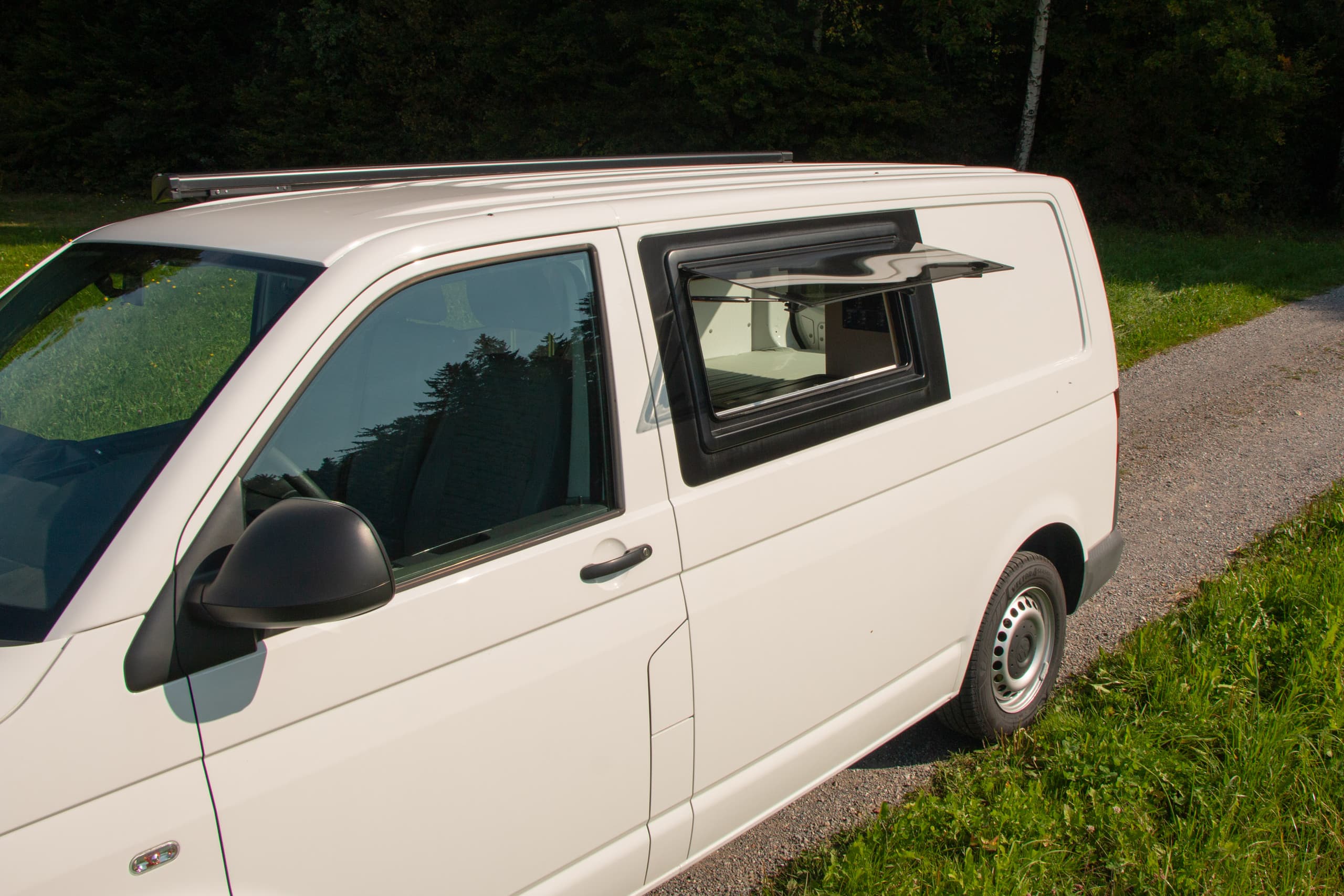 Neben der Markise dürften die beiden Fenster von aussen die auffälligste Veränderung sein. Mir war es sehr wichtig, Ausstellfenster zu haben, die sich auch bei Regen öffnen lassen. Nach langer Suche habe ich aus Deutschland einen Umbausatz importiert. Der war mit Zoll und Versandkosten echt teuer, gefällt mir aber optisch sehr gut, weil die mitgelieferten schwarzen Bleche die Vertiefung im Bus perfekt ausfüllen. Zusammen mit den flachen, dunkel getönten Fenstern (vermutlich Seitz D-Lux) ergibt sich für mich ein stimmiges Gesamtbild. Die Innenrahmen und Verkleidungen musste ich selbst anfertigen, das mitgelieferte Material entsprach nicht meinen Vorstellungen. Aufmerksame Leser werden auf den Fotos sehen, dass ein Fenster nicht mehr 100% dicht ist. Das wird vermutlich an der Dichtmasse liegen. Mit dem Dekasyl war ich schon beim Einbau nicht ganz glücklich.