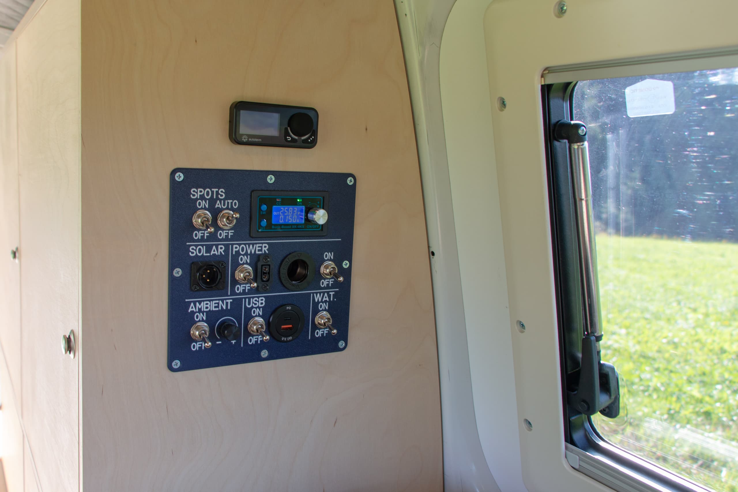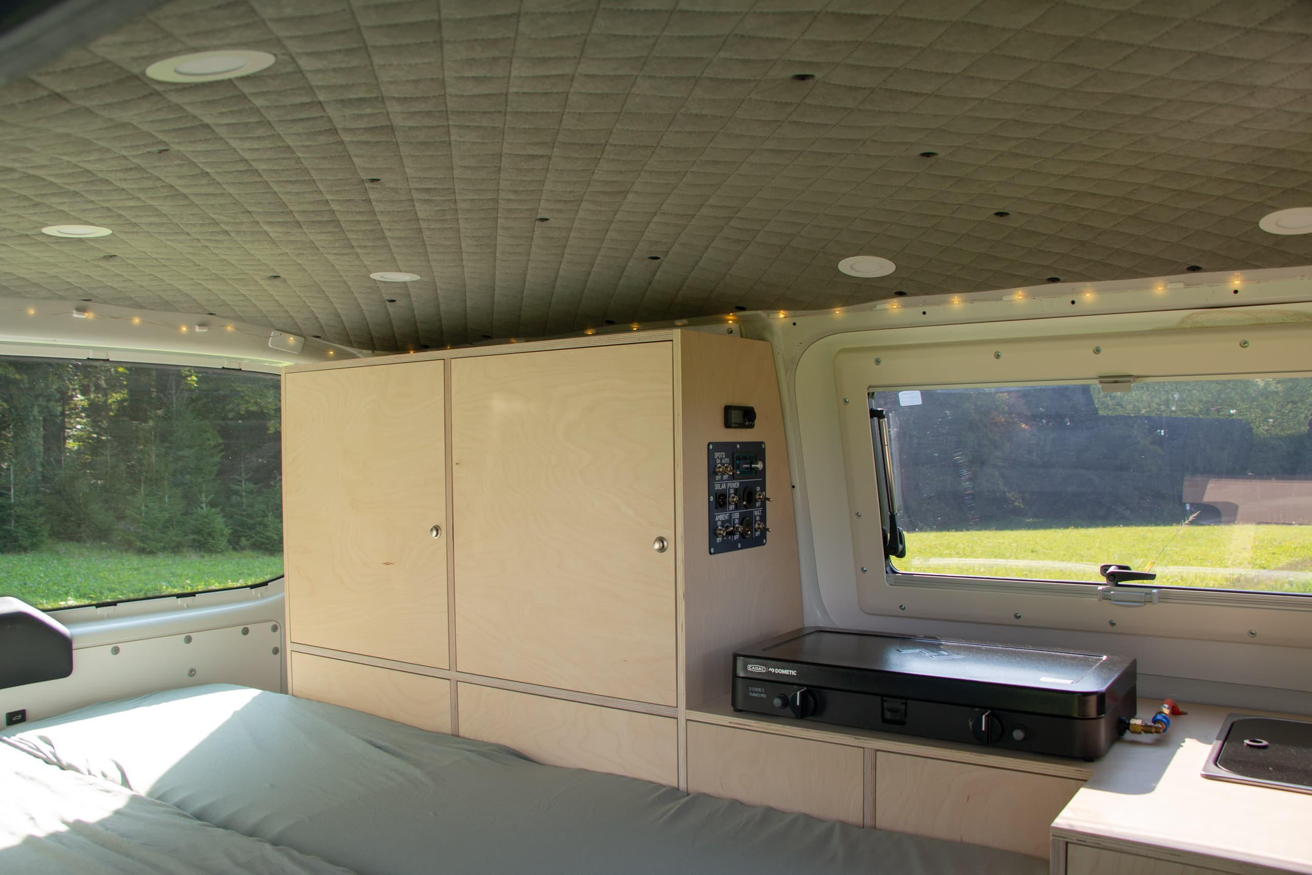 Neben der Kühlschublade gibt es Ladeanschlüsse. An der Decke sind LED Spots und eine Lichterkette montiert. In der Verkleidung der Heckklappe sind ebenfalls kleine Spots integriert. So kann man auch im Dunkeln bequem hinten etwas verräumen. Gesteuert wird alles über ein zentrales Panel am Schrank. Dort gibt es auch nochmals ein paar Ladeanschlüsse. Die Deckenspots lassen sich neben der manuellen Bedienung auch automatisch über die original verbaute Lichtsteuerung beim Öffnen der Türen einschalten. Zusätzlich sind sie über das Display dimmbar.