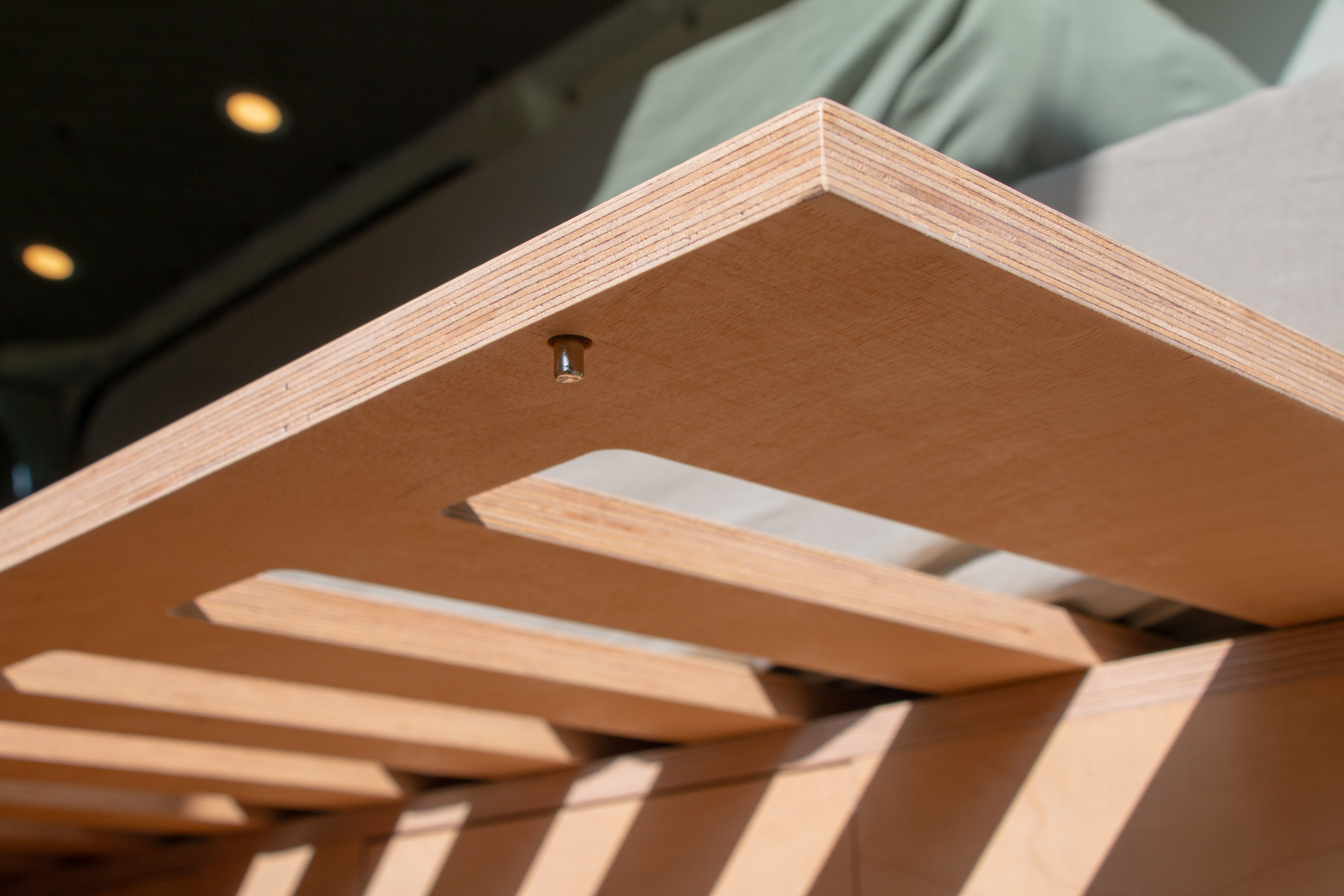 Um ein genügend grosses Bett zu erhalten, lässt sich die Bank gegen den Schrank ausziehen. Der Lattenrost ist in zwei Teile unterteilt. Diese liegen am Schrank auf einer Kante auf und werden von Metallstiften gesichert, damit sie nicht verrutschen können. Aus meiner Sicht zeigt sich da der Vorteil der CNC-Fräse extrem. Die Lattenroste verzahnen sich passgenau mit dem feststehenden Teil, leider auf dem Foto von der Matratze verdeckt. Das hätte ich persönlich manuell niemals in dieser Präzision hingekriegt.