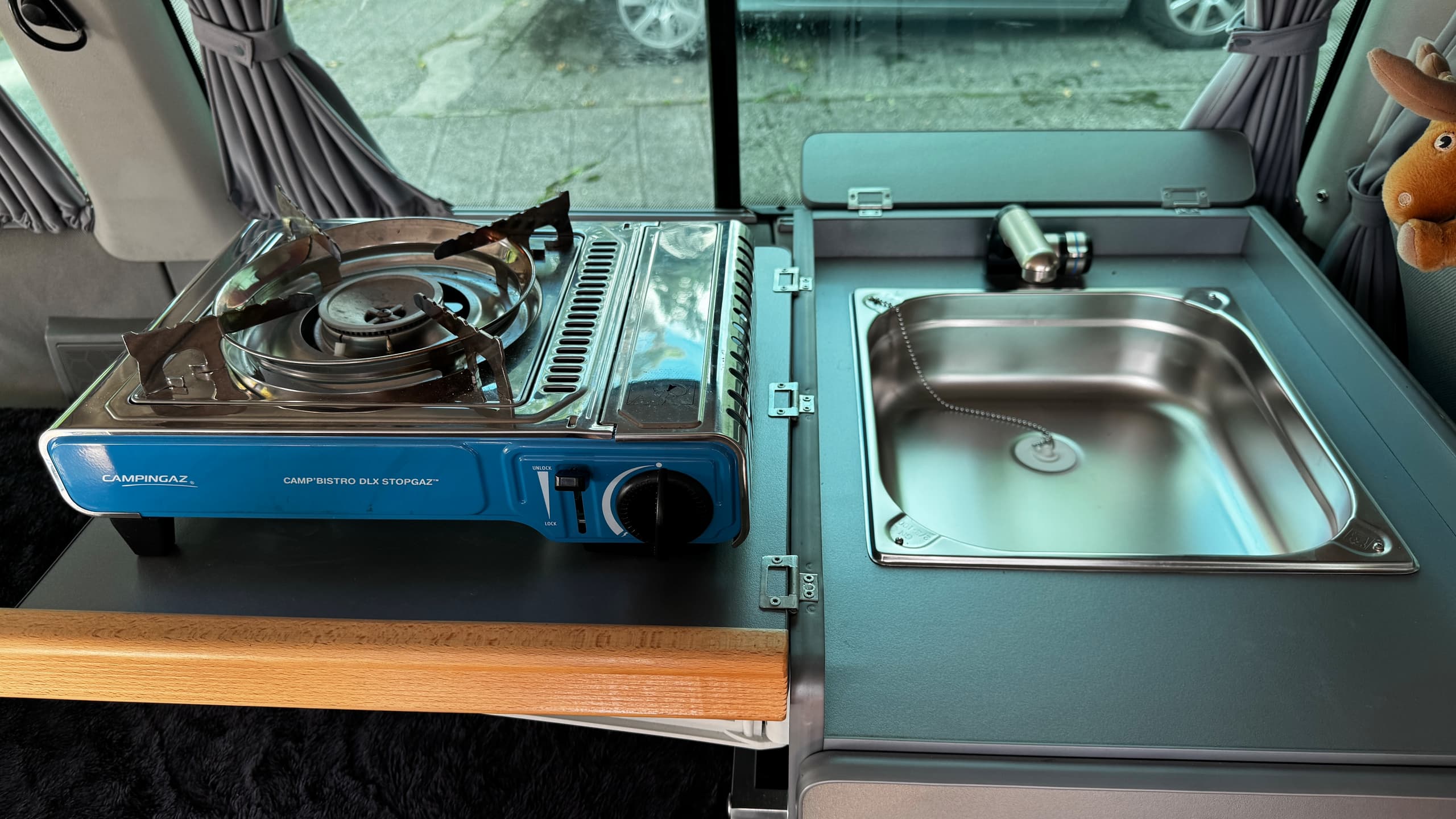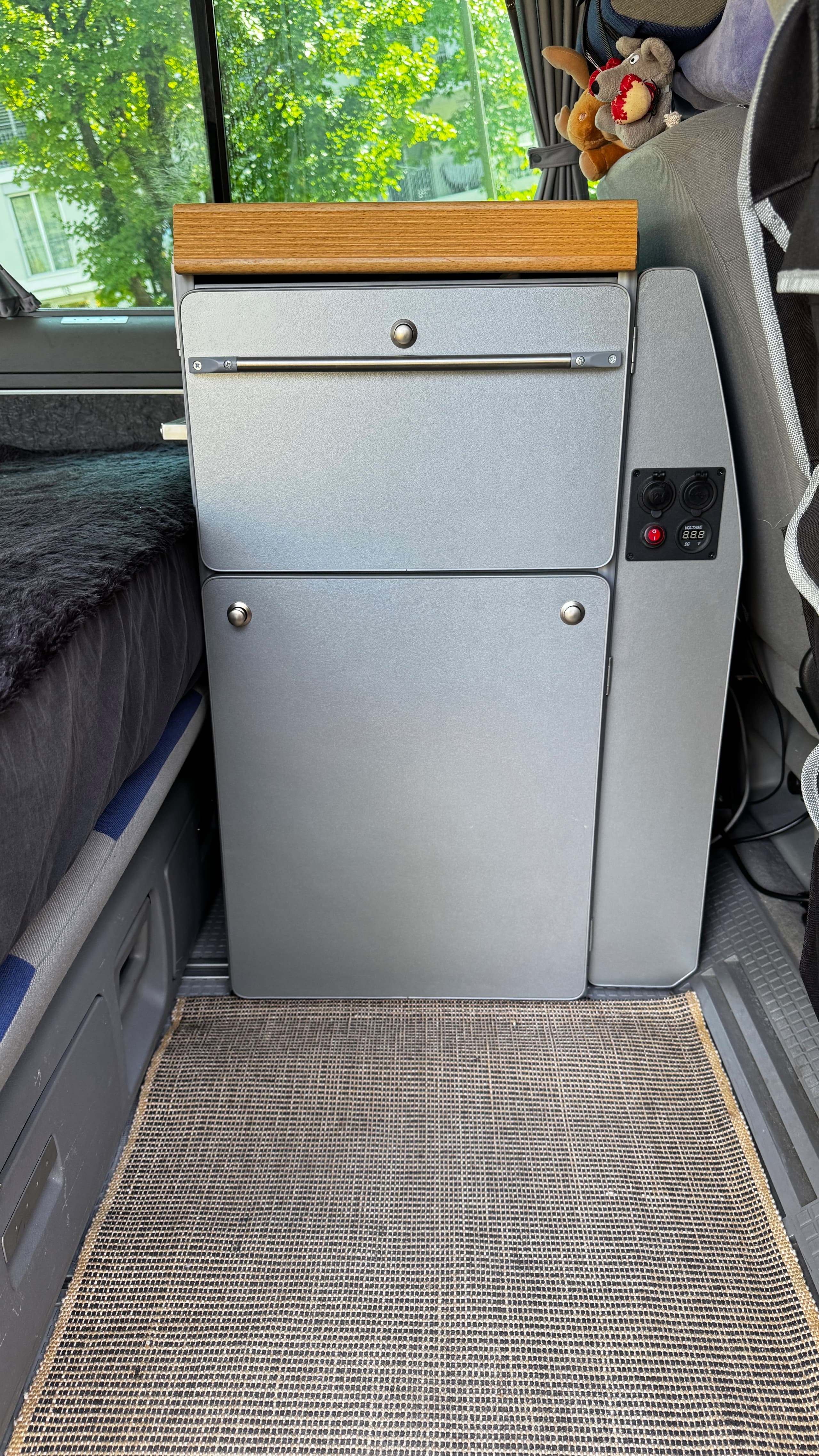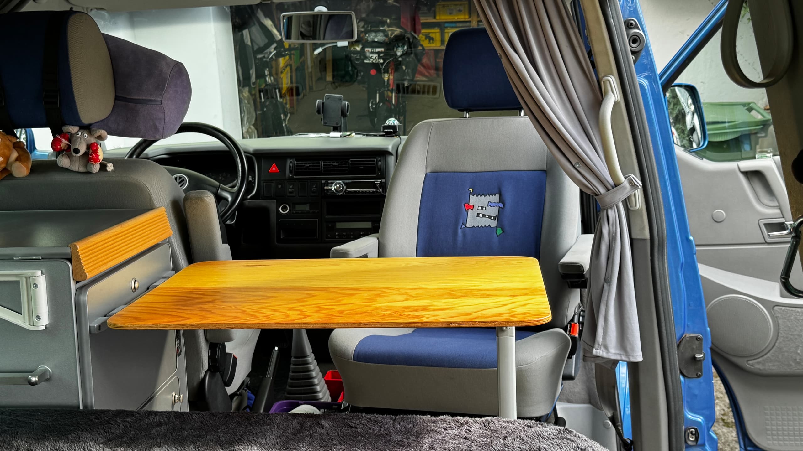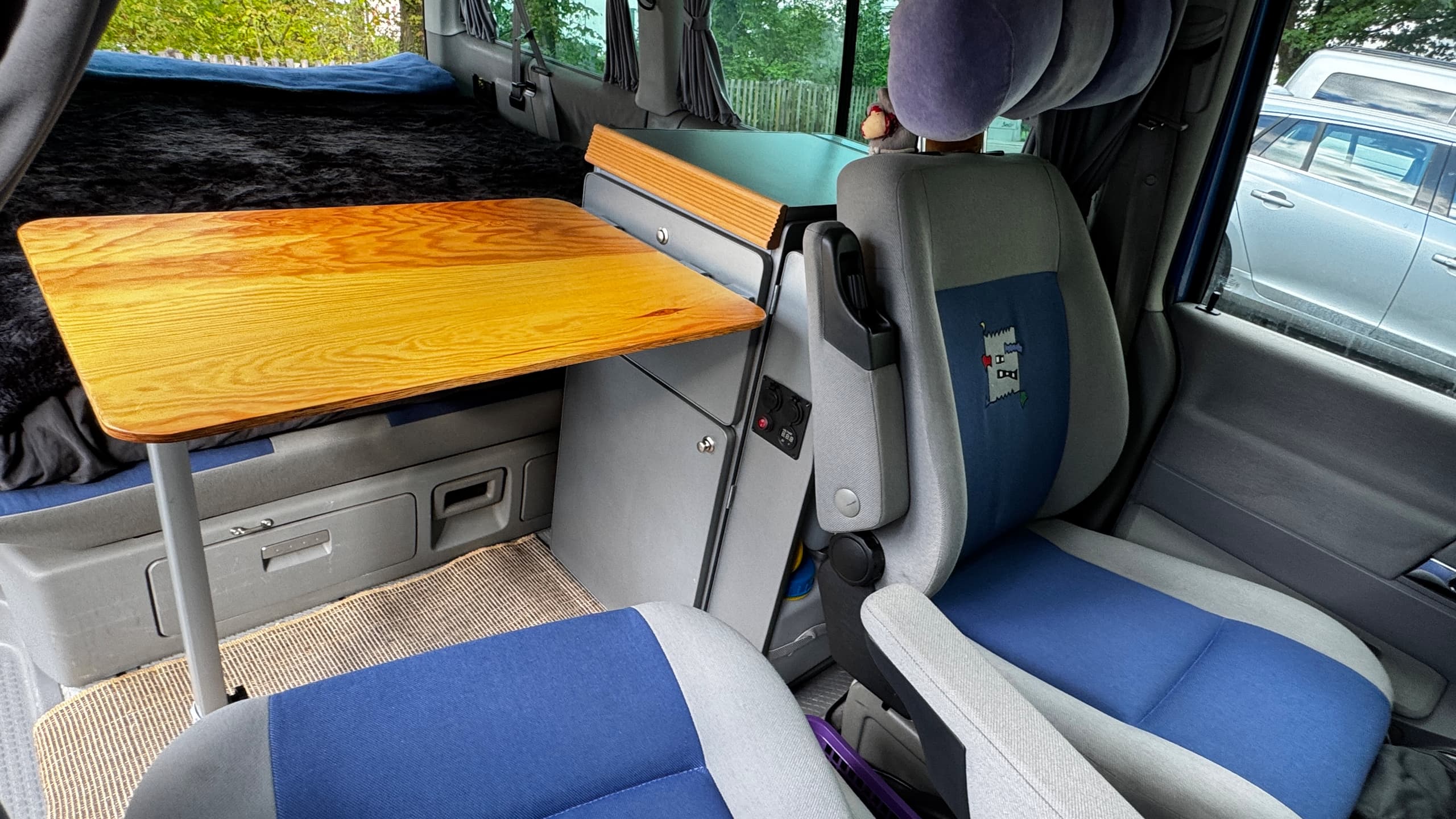 Tisch 68x50cm am Küchenmodul einhängbar und drehbarer Beifahrersitz.
