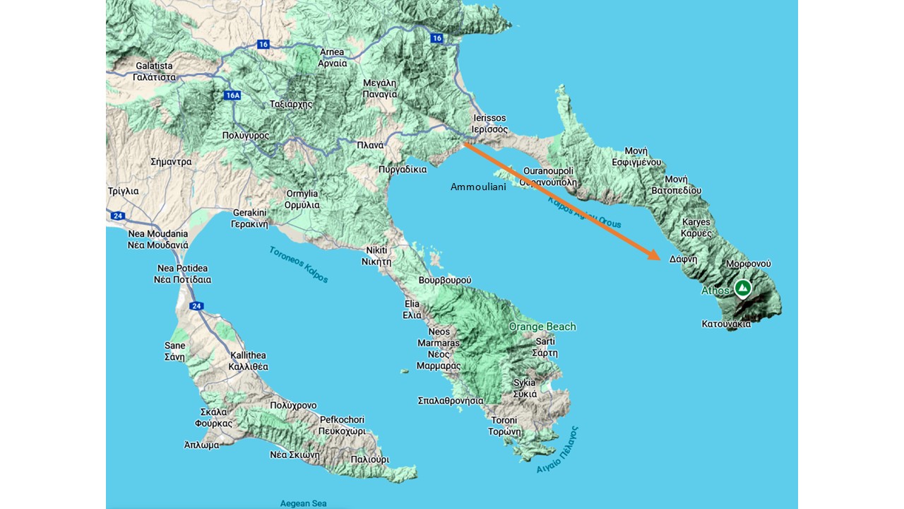 Hier noch ein Bild mit meinem Fotostandort und der Aufnahmerichtung über die Insel Ammouliani im Vordergrund: